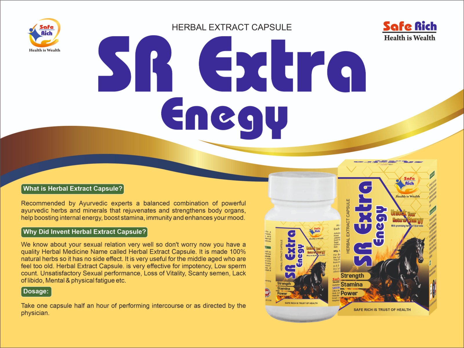 Helps increase strength, stamina, and power Supports energy levels and vitality Helps improve physical and mental performance Useful in managing fatigue, weakness, and low energy Supports male wellness and confidence Helps enhance mood and overall well-being Product Overview Recommended by Ayurvedic experts, SR Extra Energy works by nourishing body organs from within and supporting natural energy production. It is made with 100% natural herbal ingredients, making it safe for regular use when taken as advised. Made with natural herbal extracts No known side effects when used as directed Not recommended for children Consult a physician if you have any medical condition